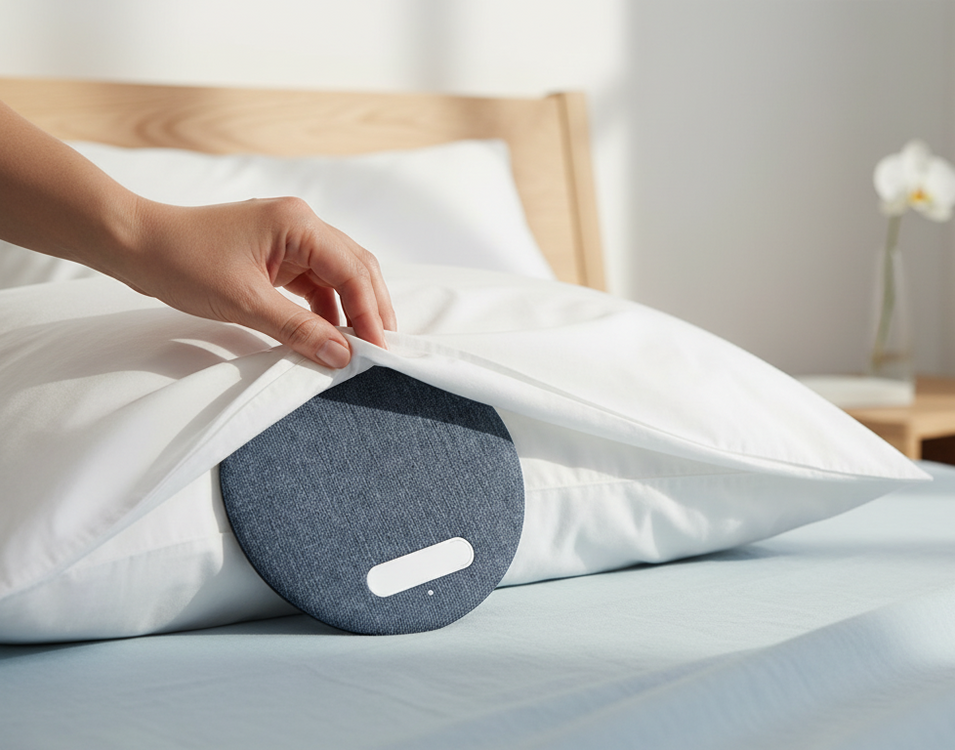 Browse real-life snapshots of SleepPod at home and on the go. Discover how the under-pillow design delivers soothing audio without earbuds, ensuring peaceful rest anywhere.
